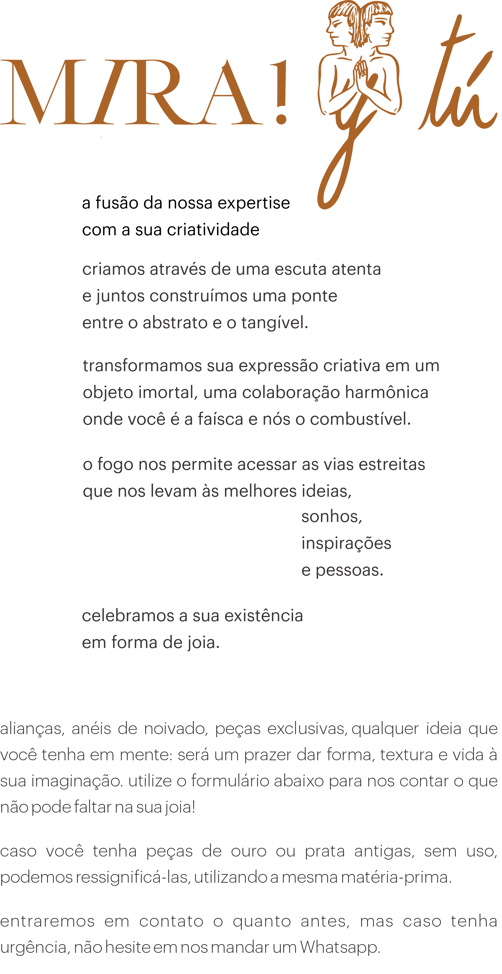 qualquer ideia que você tenha em mente: será um prazer dar forma, textura e vida à sua imaginação. utilize o formulário abaixo para nos contar o que não pode faltar na sua joia!